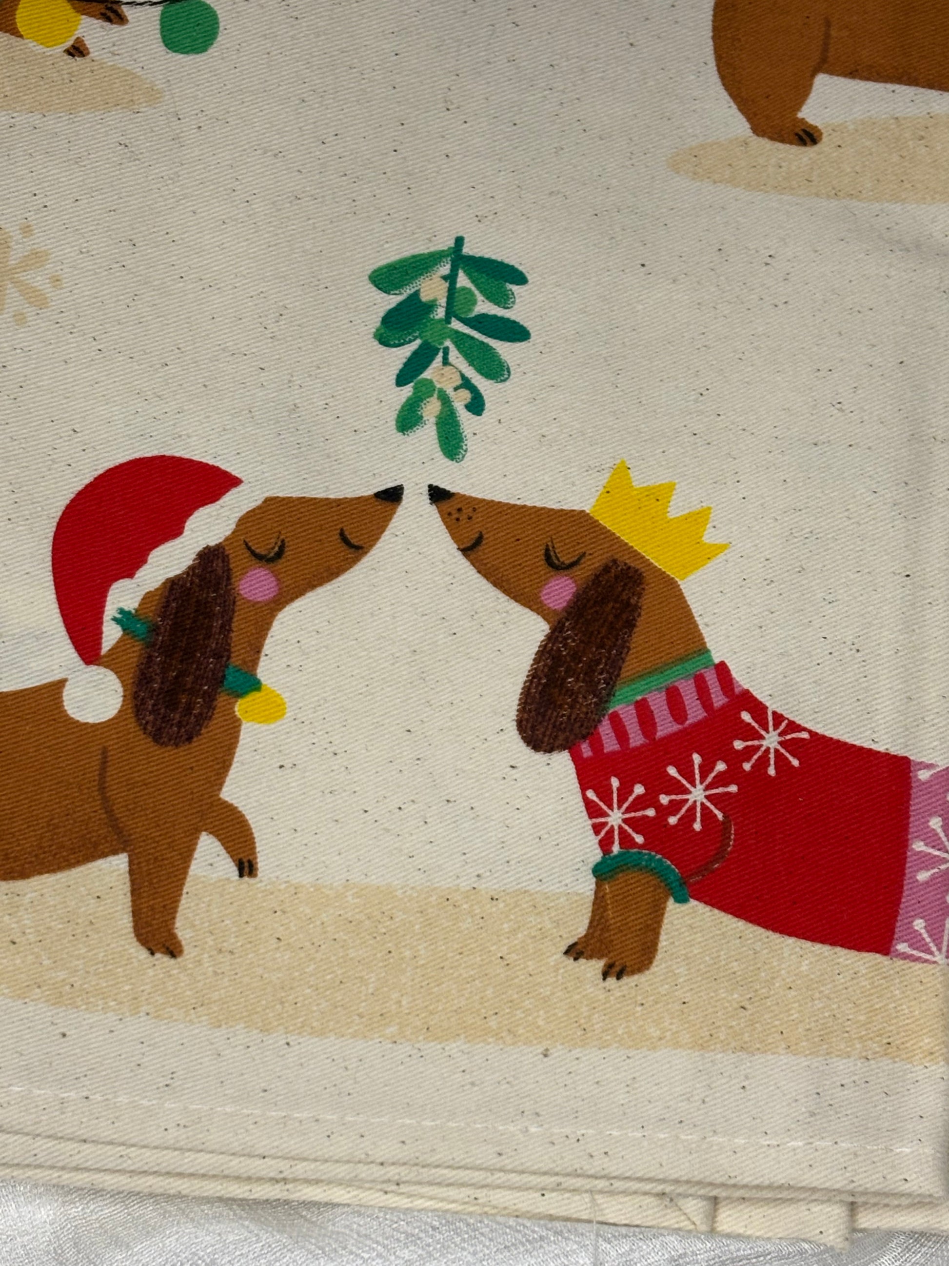 100% katoenen theedoek met onze lieve worsthond in verschillende feestelijke kledij en scènes. Een functionele en decoratieve toevoeging aan elke keuken. Perfect voor het opdrogen van de vaat tijdens de feestdagen, vooral na het kerstdiner!