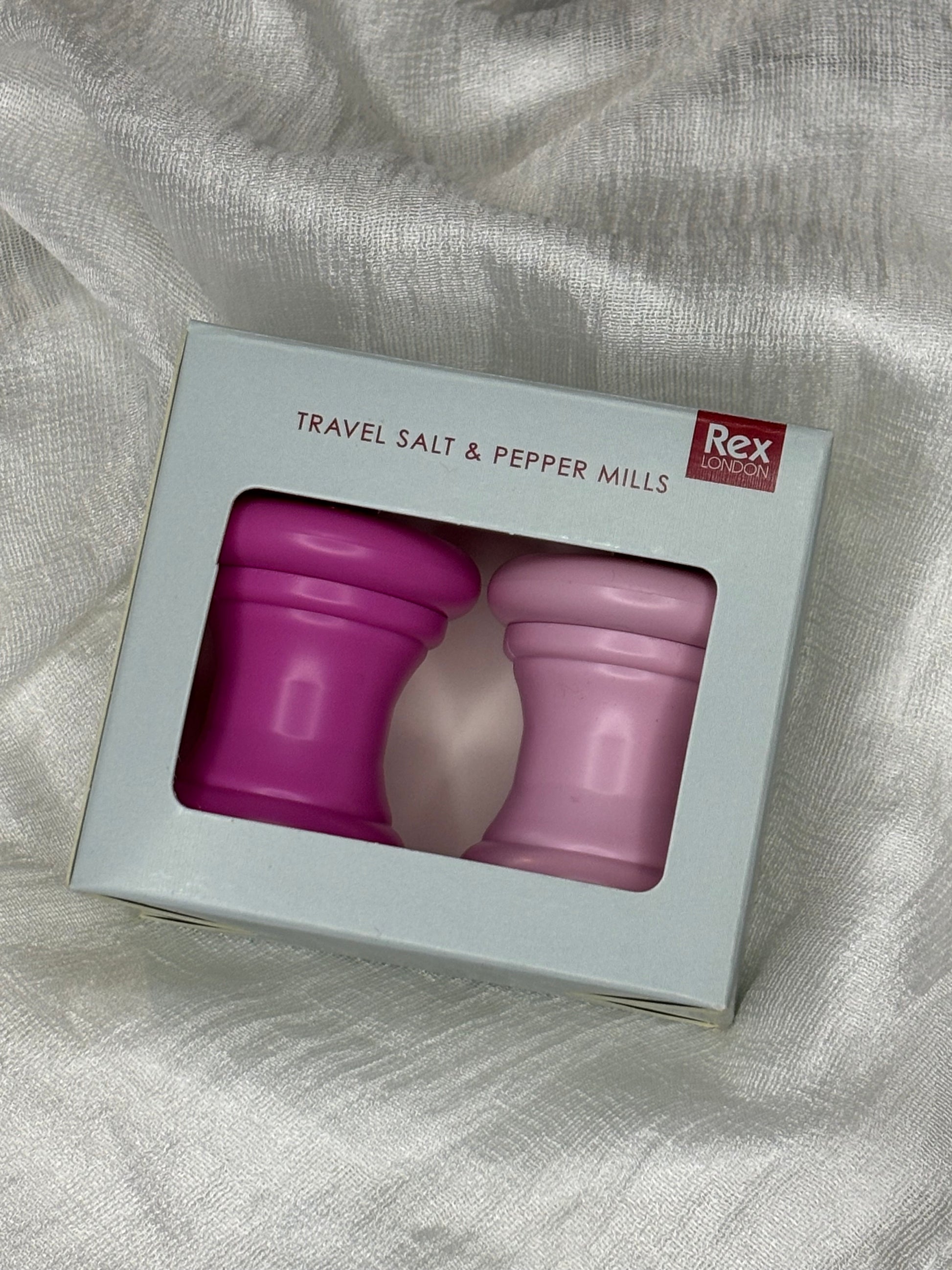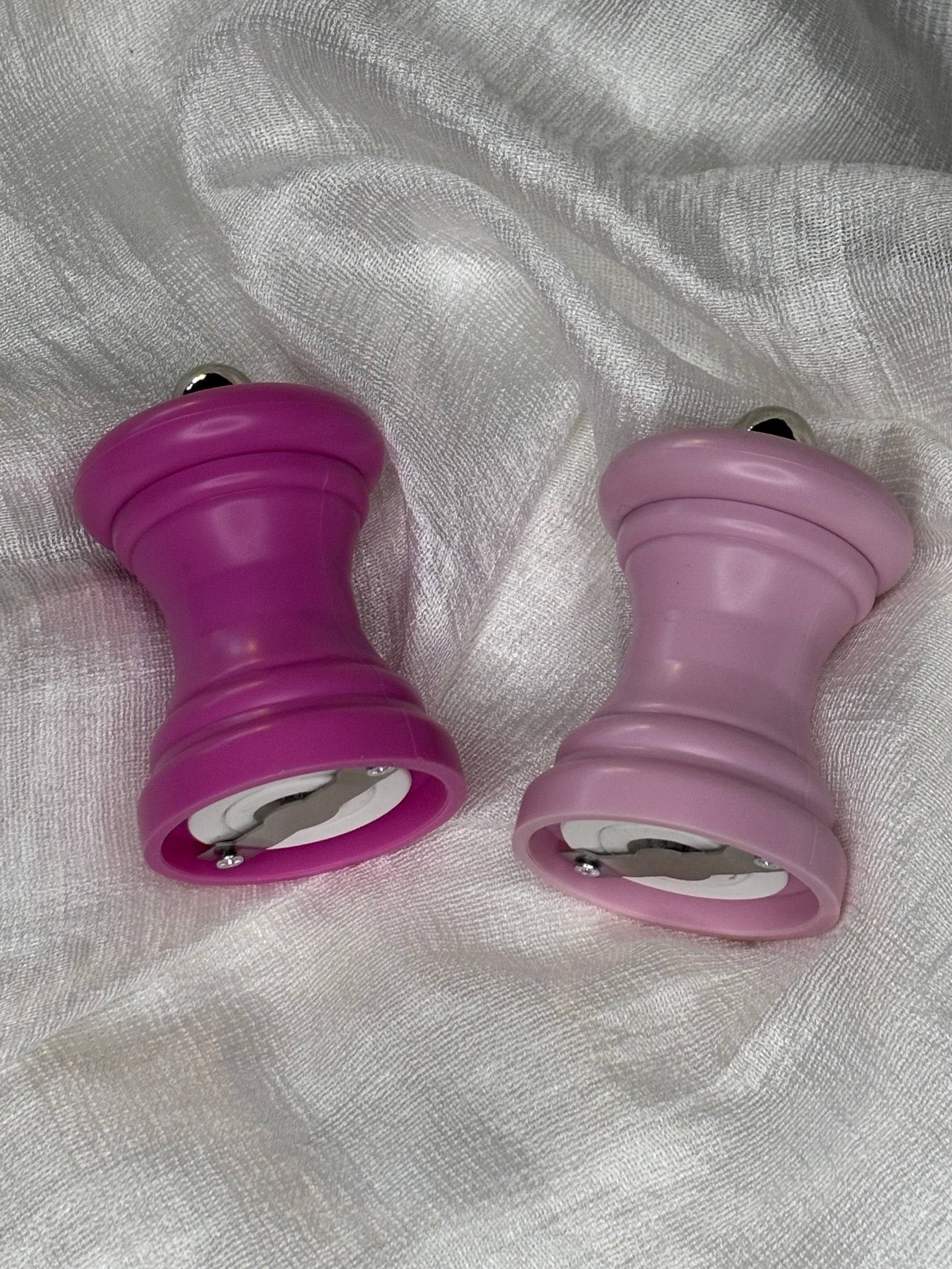 Paar compacte molens voor het malen van zout en peper, elk in verschillende tinten roze. Perfect voor als kruiden onderweg nodig zijn, tijdens picknicks, kampeertochten, enz.