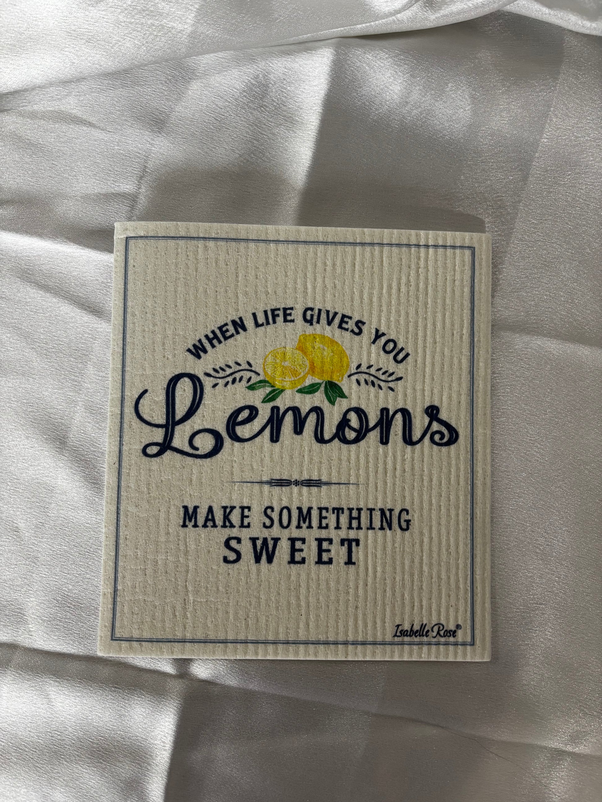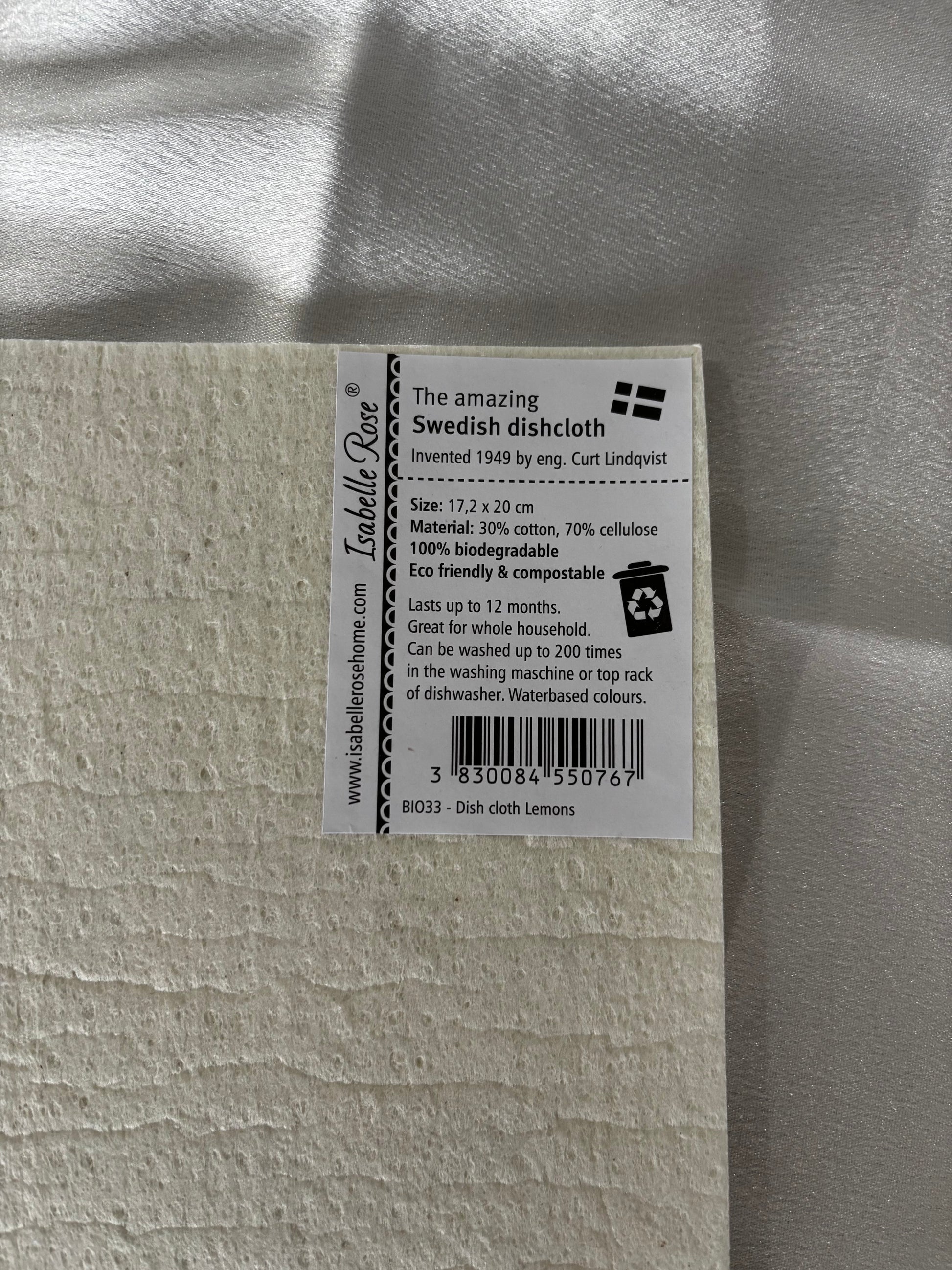 Zweeds vaatdoek van hoge kwaliteit gemaakt van een mengsel van katoen en cellulose in Lemons design. FORMAAT: 17 x 20 cm MATERIAAL: 30% katoen, 70% cellulose 100% biologisch afbreekbaar GEEN GEUR NA GEBRUIK Milieuvriendelijk en composteerbaar Gaat tot 12 maanden mee Geweldig voor het hele huishouden Kan tot 200 keer worden gewassen in de wasmachine of het bovenste rek van de vaatwasser Kleuren op waterbasis