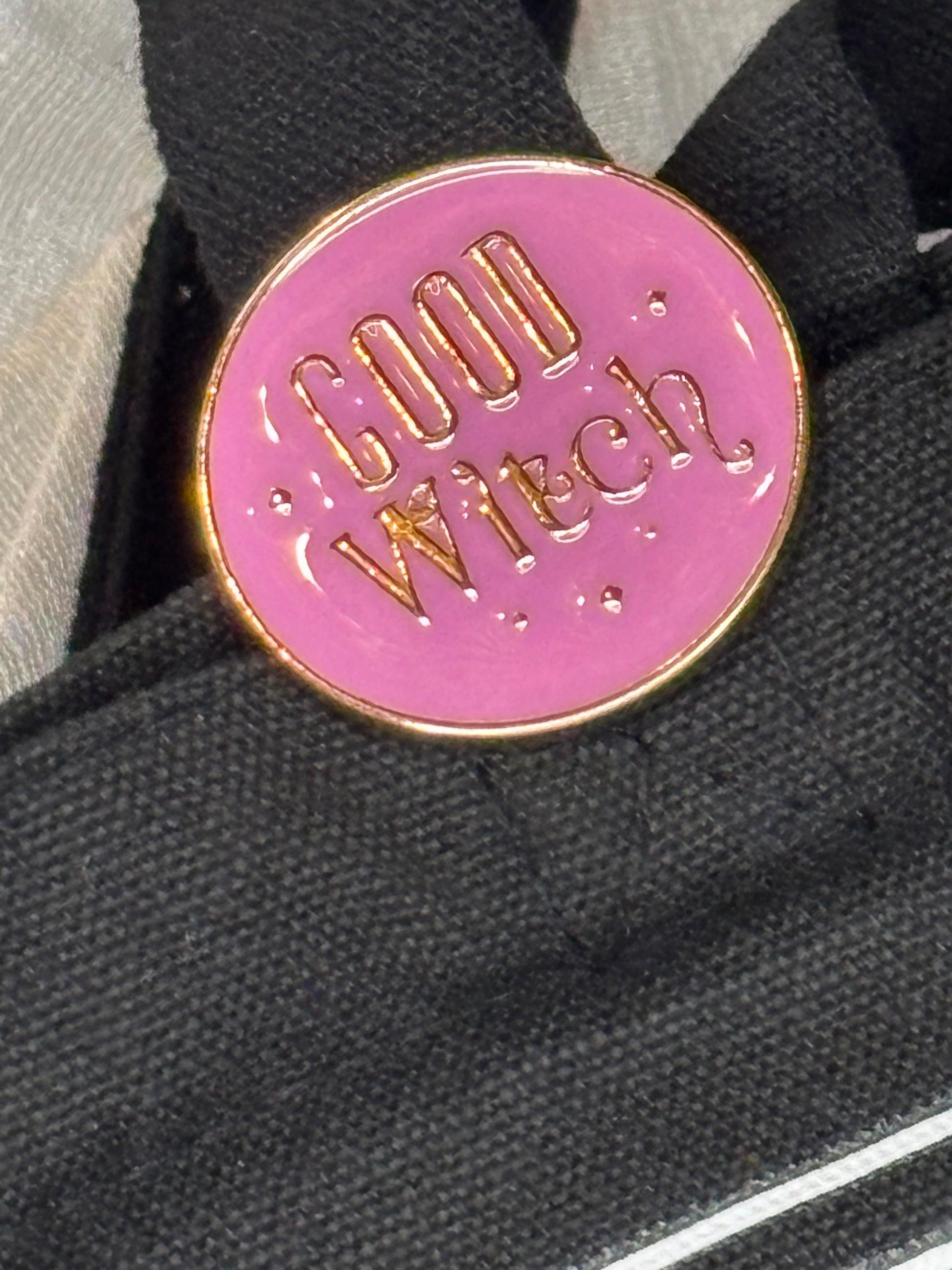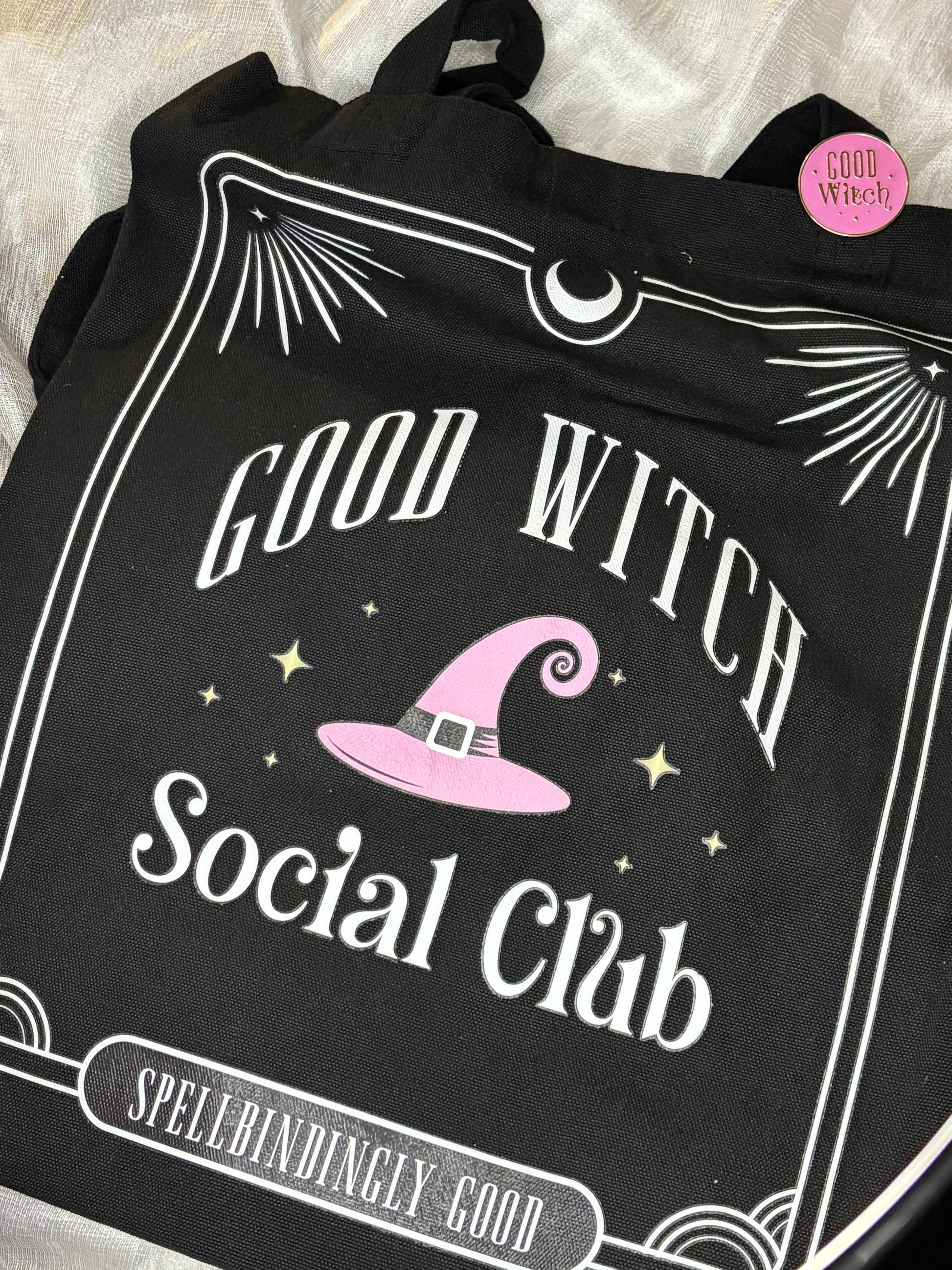 Show off your soft side with this black polycotton tote bag featuring Good Witch Social Club text and a matching enamel pin badge. Great for carrying spellbooks, snacks, or everyday essentials with a hint of witchy flair. 98% polyester, 2% cotton.