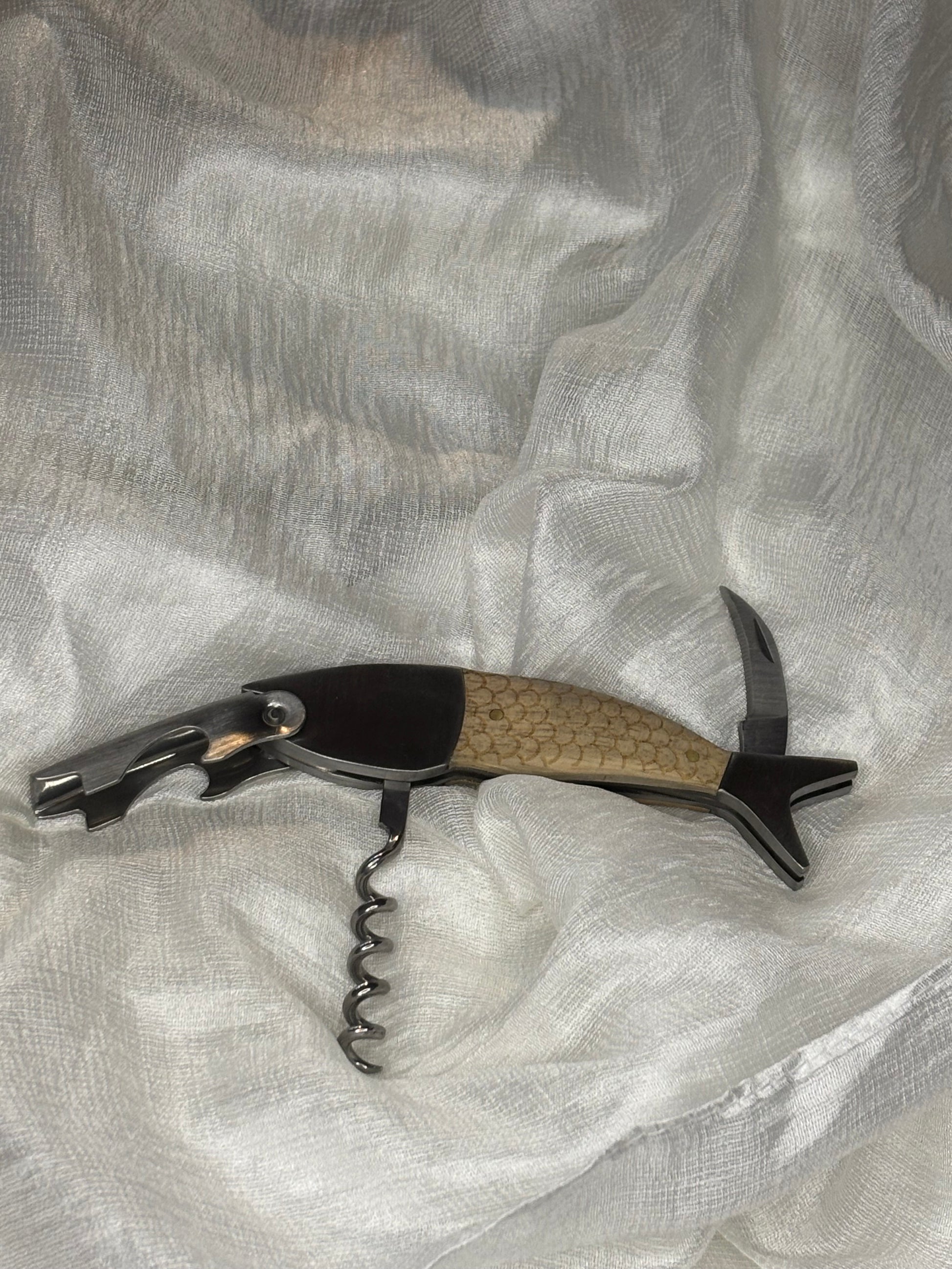 Visvormige kurkentrekker in een decoratief blik. Gemaakt van roestvrij staal en hout, geeft deze tweetraps kurkentrekker de beste hefboomwerking bij het verwijderen van natuurlijke of synthetische kurken. Het bevat een opvouwbaar snijmes, ingebouwde flesopener en gebruiksaanwijzing in het Engels, Frans, Duits en Spaans.